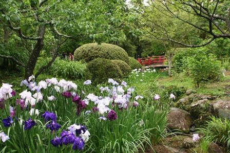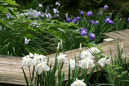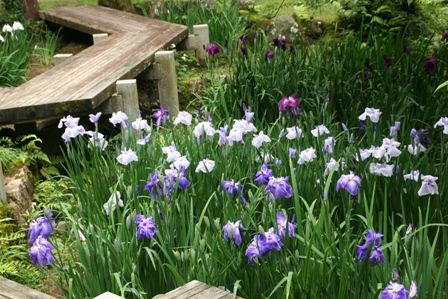 花菖蒲の中の橋を歩いて行くと気持ち良いです。
