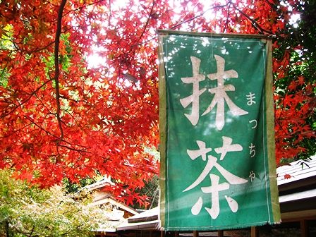 春日大社参道の茶店の旗 緑が紅葉とマッチしてます。