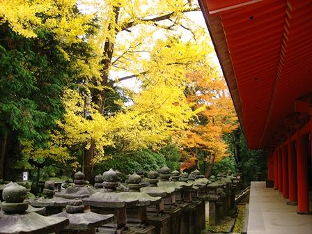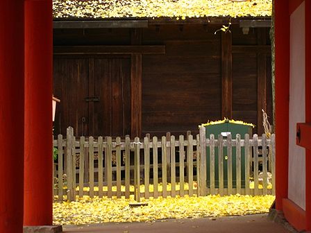 春日大社境内です。緑→黄色→オレンジ→赤(朱色)のグラデーションが面白いです。