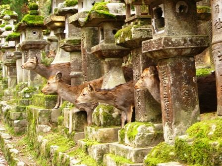 参道の燈籠の間から、鹿が何頭も顔を出してるのが、面白かったです。