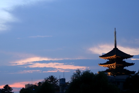 カメラと三脚持参で、奈良公園へ向いました。まだ日が沈む前で、夕焼けがきれいだったので、撮影する事にしました。浮見堂の近くに荒池があります。その真ん中に道路と言うか橋がかかっているんですが、そこから興福寺の五重塔の夕景が撮れるのです。