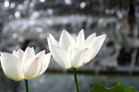 噴水を借景にした白い蓮の花 チューリップみたいですね。