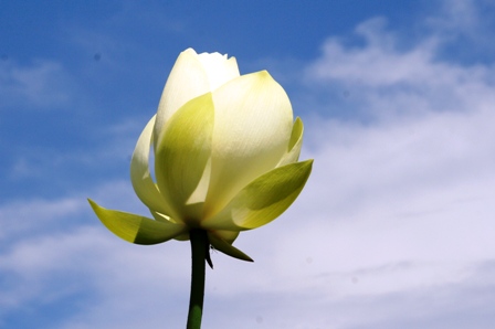 夏の青空を借景にした白い蓮の花