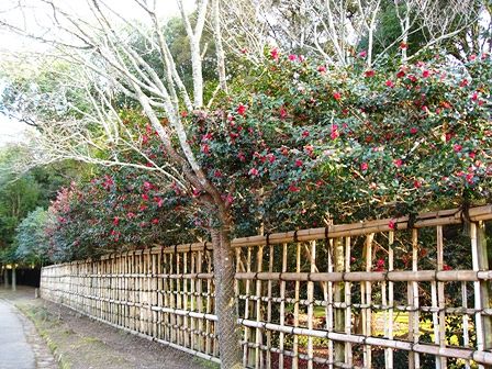 奈良県新公会堂の中に入ると立て札があって「立寒椿(たちかんつばき)」と書いてあるんですよ。