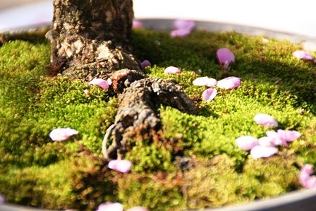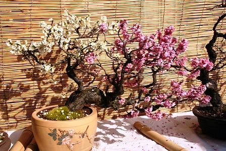 盆梅展も楽しみの一つ。同じ木から紅白の花を咲かせています。