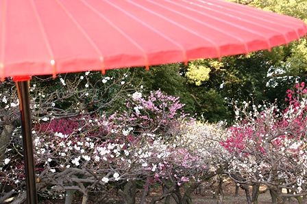 赤い傘と梅の花と白梅の枝垂れ梅の写真が好きですね。