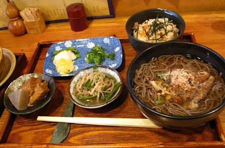 これは主人が食べた山菜そば定食 おそばとかやくご飯と二品とお漬物