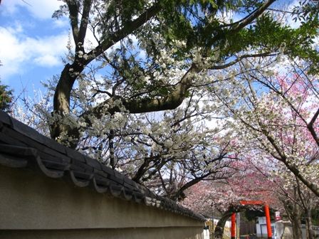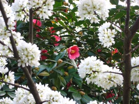 すぐ近くの建物のお庭にもスモモが満開。スモモに囲まれた椿
