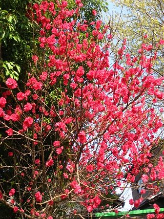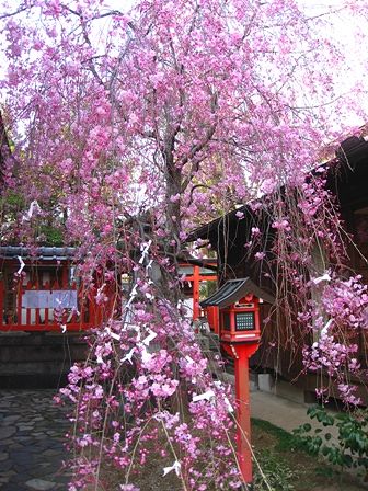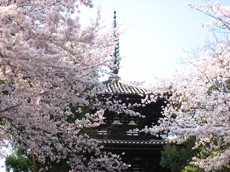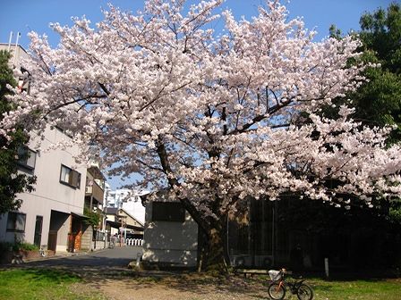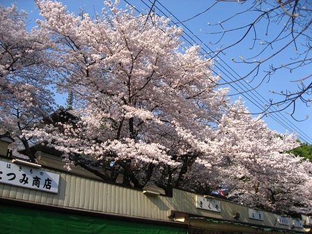 三条通りのお土産物屋さんの屋根の上の桜並木
