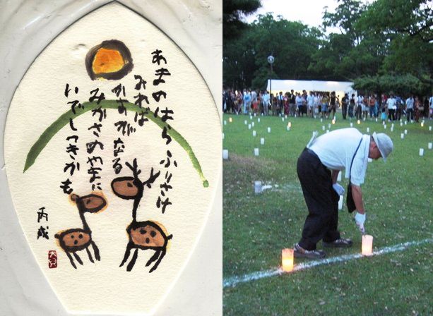 とりあえず二枚アップしました。残り二枚は燈花会の写真です。三枚目の右のようにボランティアの方があのように1個ずつロウソクに火を点けて行くのです。左のしおりは、一客一燈に参加したらもらえるそうです。一客一燈とは、500円の協力金を払えば、実際に自分で燈籠に火を灯すことが出来ると言う物です。お願い事をお祈りしながら、火を点けたら良いとか。長女がお友達と参加して来たそうです。でも、せっかく参加しておきながらこういうのがあまり好きでない娘は何もお願いしなかったそうです。お腹が空いて晩御飯の事ばかり考えてたらしく、全然ムードのない女の子です(^_^;)