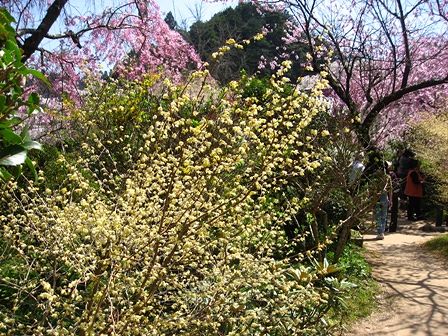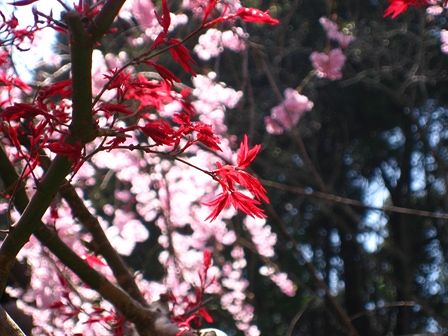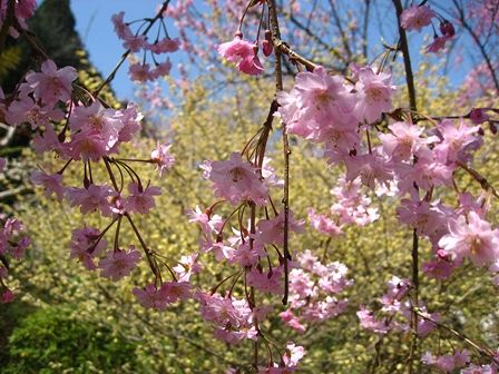 トサミズキを借景にした紅しだれ