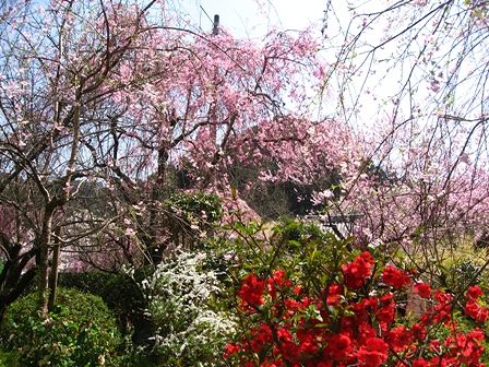 紅しだれを借景にした花の木
