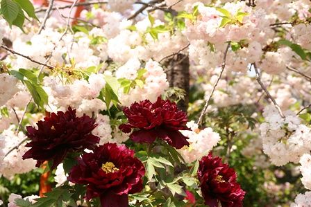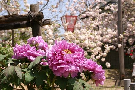 ピンク色の桜が青い空によく合ってますね。桜に牡丹のコラボもいいなあ。