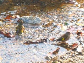 飛火野の小川で水遊びするペアのカワラヒワ