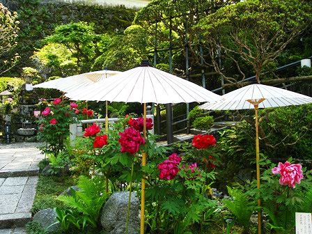 岡寺の境内はボタンが満開です。日傘が良いですね。
