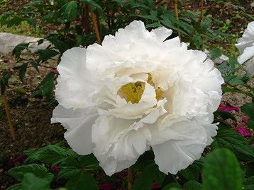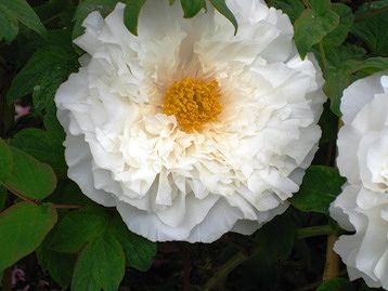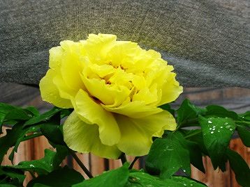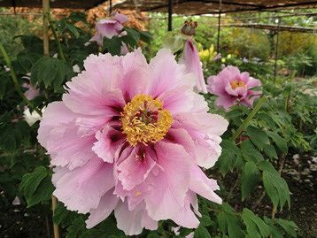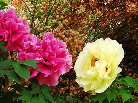 色鮮やかで大きな花王(左)と黄冠(右)の2ショット 後ろはエニシダ