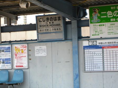 二色の浜の駅のホーム 駅名の看板がちょっと懐かしい感じです。