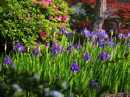 まず、アヤメがあちこちで見られて、その次に池でカキツバタが一斉に咲き出し、
