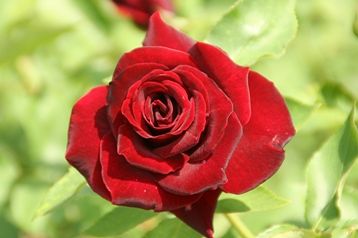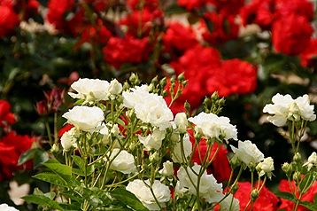 真っ赤なバラを借景に純白のバラを撮りました。