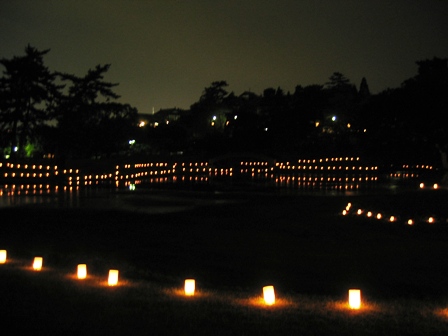 です。なら工藝館がならまちの入り口辺りなら、ここは、もうならまちの一番端っこですね。こちらも燈花会に合わせて、お庭に燈籠が250個並べられています。ただ、お庭に出れないので、お部屋のベランダのような所からの鑑賞ですので、思うようなアングルの写真は撮れませんでした。でも、とても広いお庭ですので、また奈良公園とは違った趣がありました。