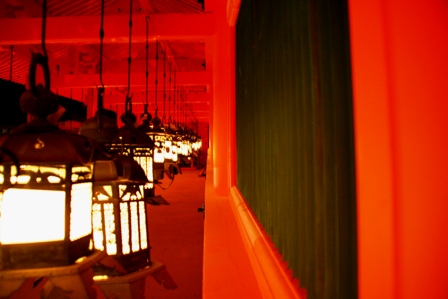 一つ一つの燈籠はとても綺麗で、りっぱな物ばかりでした。ロウソクの灯がとても神秘的で、別世界のようでした。春日大社の建物の朱色と燈籠がとてもマッチしていました。