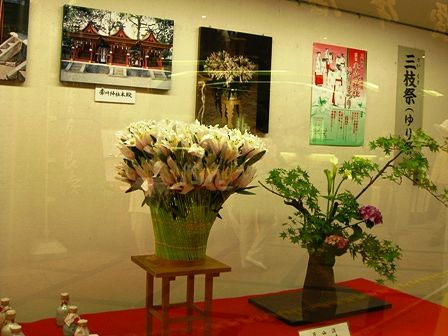 東向き商店街の南都銀行のディスプレー ゆり祭りは6/17です。