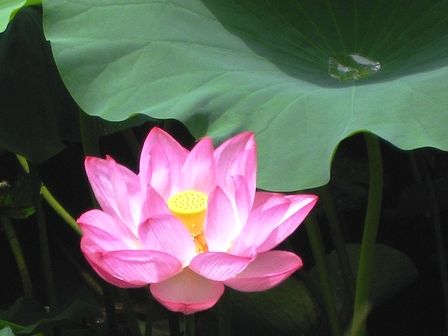 ピンクの花と葉っぱ 葉っぱの上には水溜りが。