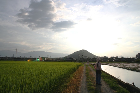 そして、本薬師寺に到着しましたら、昨日のような景色が見えたのです。しばらくして、娘が何やら見つけたようです。向こうの方にピンク色の花が見えます。何だろうと近づいて見ますと、何と蓮の花が咲いているではないですか!もうびっくりです。蓮の群生です。夕方なので、花は閉じていましたが、かなりの花の数がありました。つぼみも一杯ありましたので、まだ当分は見れそうです。