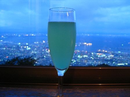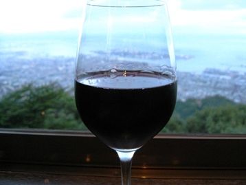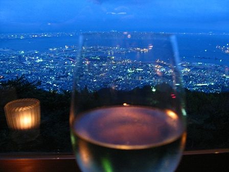 白ワインを注文。グラス越しの夜景を撮ってみました。
