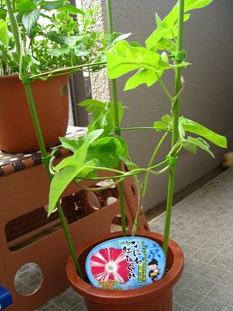 初登場のアサガオです。6/27にいつも買い物をするスーパーで苗を購入。