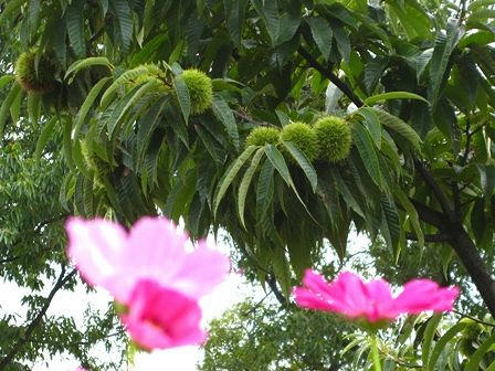 コスモス畑の真ん中に栗の木があります。イガが一杯なってます。