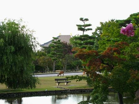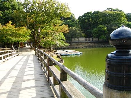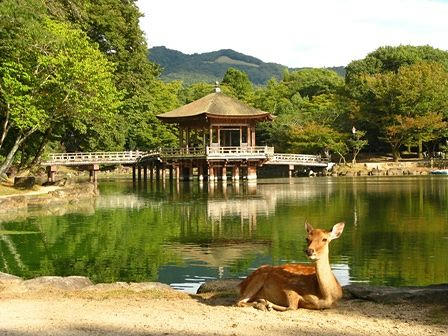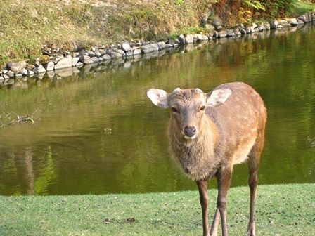 鹿の後ろに鷺池と浮見堂、その向こうが高円山です。