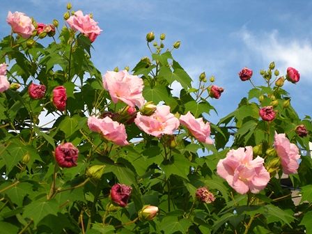 青空を借景に 酔芙蓉が満開です。