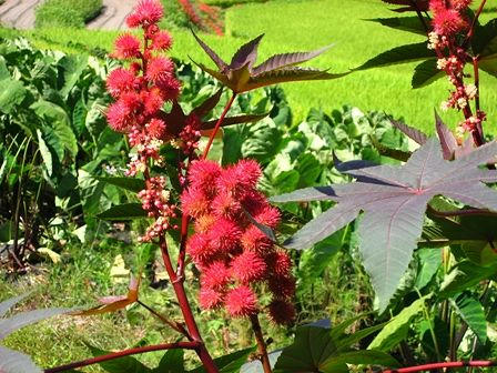 赤いイガグリ? 調べたらトウゴマ(唐胡麻)の実なんだそうです。