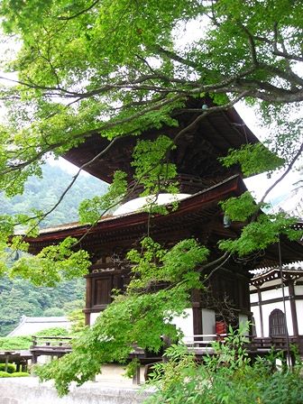 もみじの新緑越しの多宝塔