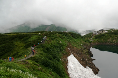 もう天候だけはどうしようも出来ませんからね。諦めるしかありません。そして、次にトロリーバスで室堂へ向いました。これが最後のチャンスです。主人もここをメインイベントと考えていたらしく、たっぷりと1時間以上滞在時間を予定していました。ここは、北アルプスの山々を望むだけでなく、ミクリガ池と言う池がとても綺麗らしいのです。