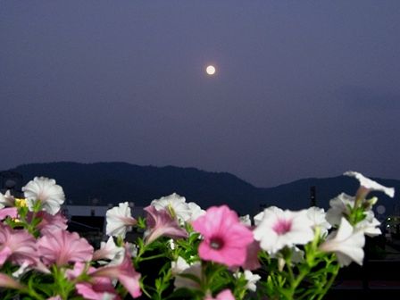 春日山から上る満月 手前はベランダのスーパーチュニア