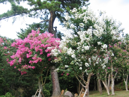 一枚目の写真は、紅白の百日紅が並んで咲いている所です。松の木もあって、何か縁起が良いですね。