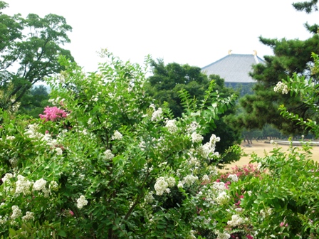 そして、四枚目は東大寺の境内です。鏡池の淵に1本白い百日紅が咲いていました。ちょうど中門と回廊の前です。ほとんど立ち止まる人もいず、普通なら気付かずに通り過ぎるでしょうね。私もこの日、初めて気付きましたから。注意すれば本当にいろんな所に咲いているんですね。