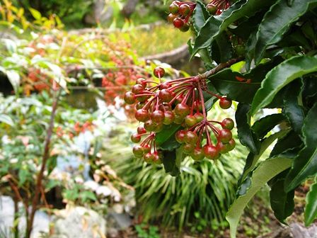 万両の実が一杯 緑から赤に変化する途中です。