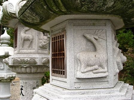 境内にはたくさんの石灯篭があります。鹿の姿が彫られています。