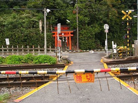 近鉄平城駅の踏切を渡ります。向こうに鳥居が見えます。