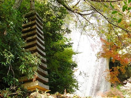 十三重の石塔(左側)と磨崖仏 残念ながら、磨崖仏(右側)は彫られたのがもう見られません。