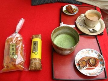 お抹茶には柿の和菓子、コーヒーにはチョコのお菓子が付いていました。