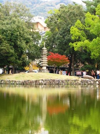 猿沢池の九重の石塔の横も紅葉