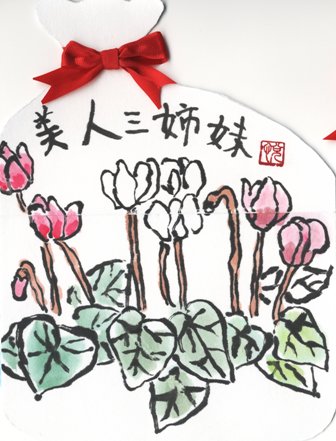 画仙紙を2枚使って、プレゼント風に切り、リボンを結んで作ります。