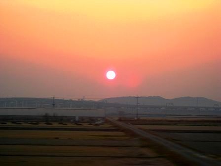 一応山に夕日が沈む所です。手前は田んぼだと思います。