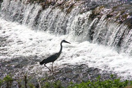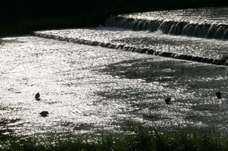 鴨川には、アオサギ、シラサギ、カルガモ等いろんな動物達がいます。行きは、水の中にアオサギが、帰りは水の中にシラサギがいたんですが、アオサギの方を掲載します。それとすごい太陽を受けて水面がキラキラと輝いている中5~6羽のカルガモの子供達が遊んでいたのを載せます。ちょっと逆光ですが、こういうのもまた良いかなあと思います。影になってるのが、カルガモ達です。
