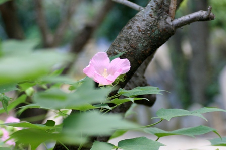 樹木をバックに上品なピンクの芙蓉が咲いています。