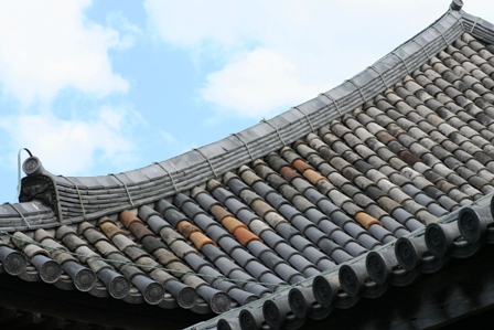 昨日はとても天気が良くて綺麗な青空でしたので、空とお堂の屋根を撮ってみました。この屋根の瓦は歴史的にとても貴重な物で、普通のと違っていて丸い瓦を重ねる手法で「行基葺き」と呼ばれているそうです。